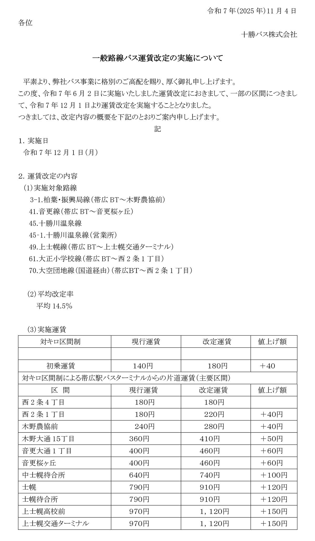 運賃改定の路線の詳細は運賃表でご確認ください。 ⇒運賃表の見方 【3-1】柏葉・振興局線 【41】音更線 【45】十勝川温泉線 【45-1】十勝川温泉(営業所) 【49】上士幌線 【61】大正小学校線 【70】大空団地線(国道38号線経由) 令和7年12月1日(月)運賃改定について Tweet