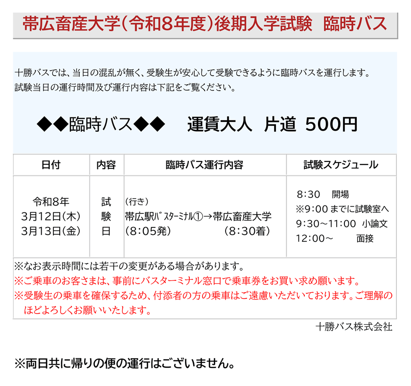 帯広畜産大学(令和8年度)後期入学試験臨時バス運行のお知らせ
